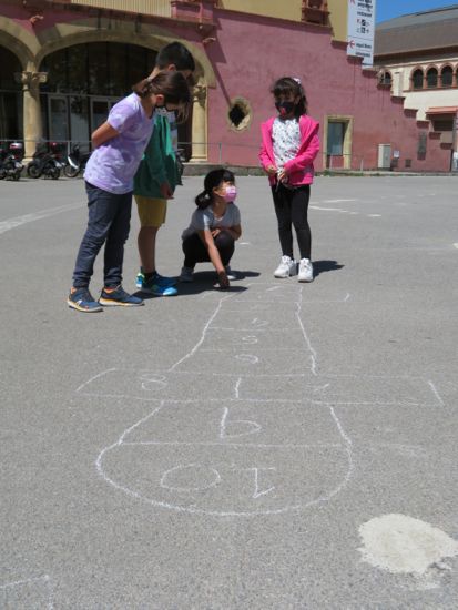 Vam fer grups de quatre nens/es i ens van donar un guix per grup. Vam dibuixar la nostra xarranca a terra, vam agafar una pedra i hi vam començar a jugar. Va ser molt divertit!