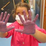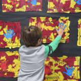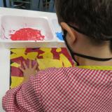 Els conceptes “esquerra” i “dreta” són molt importants per assolir correctament l’aprenentatge de la lectura i l’escriptura. A primer tornem a treballar aquests conceptes. Fem una bossa per guardar les pintures i els dibuixos, en la qual primer estripen i enganxen el paper, i després i estampen les mans.