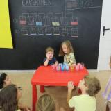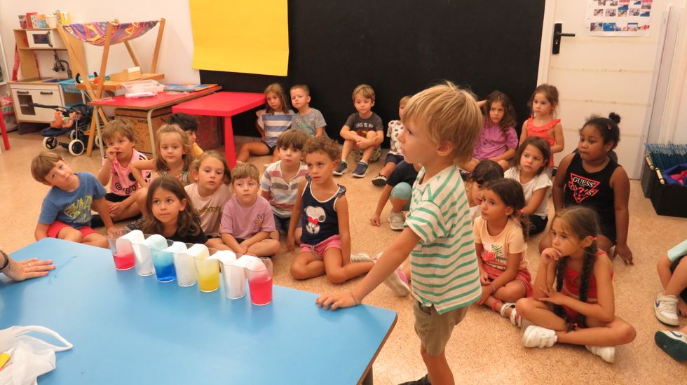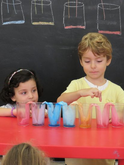 Els nens i nenes d’I5, per fi, ja han començat l’activitat que tant estaven esperant els divendres a la tarda: ELS EXPERIMENTS!, i ho hem fet d’una manera molt vistosa i curiosa. L’experiment en qüestió consistia a omplir gots d’aigua, col·locar-los en filera, intercalats amb gots buits, i afegir unes gotes de colorant amb els colors primaris (cian, magenta i groc). Finalment, els hem unit mitjançant un paper de cuina que prèviament hem plegat.