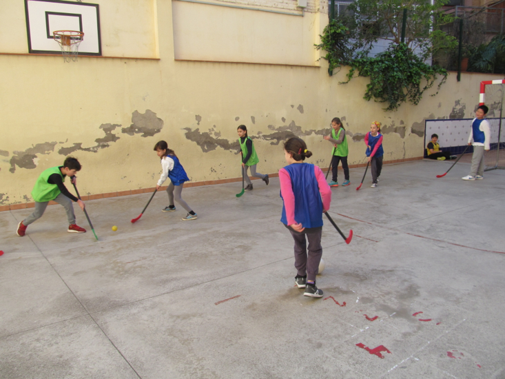 En aquest trimestre, a l’àrea d’Educació física, hem practicat dos esports: el bàsquet i l’hoquei. En aquest darrer, hem fet servir els estics i unes pilotes molt petites. Hem fet cinc sessions d’entrenament i tres de partits. Els partits eren de cinc minuts i jugàvem contra altres equips formats pels companys de classe. És molt divertit però també molt cansat!